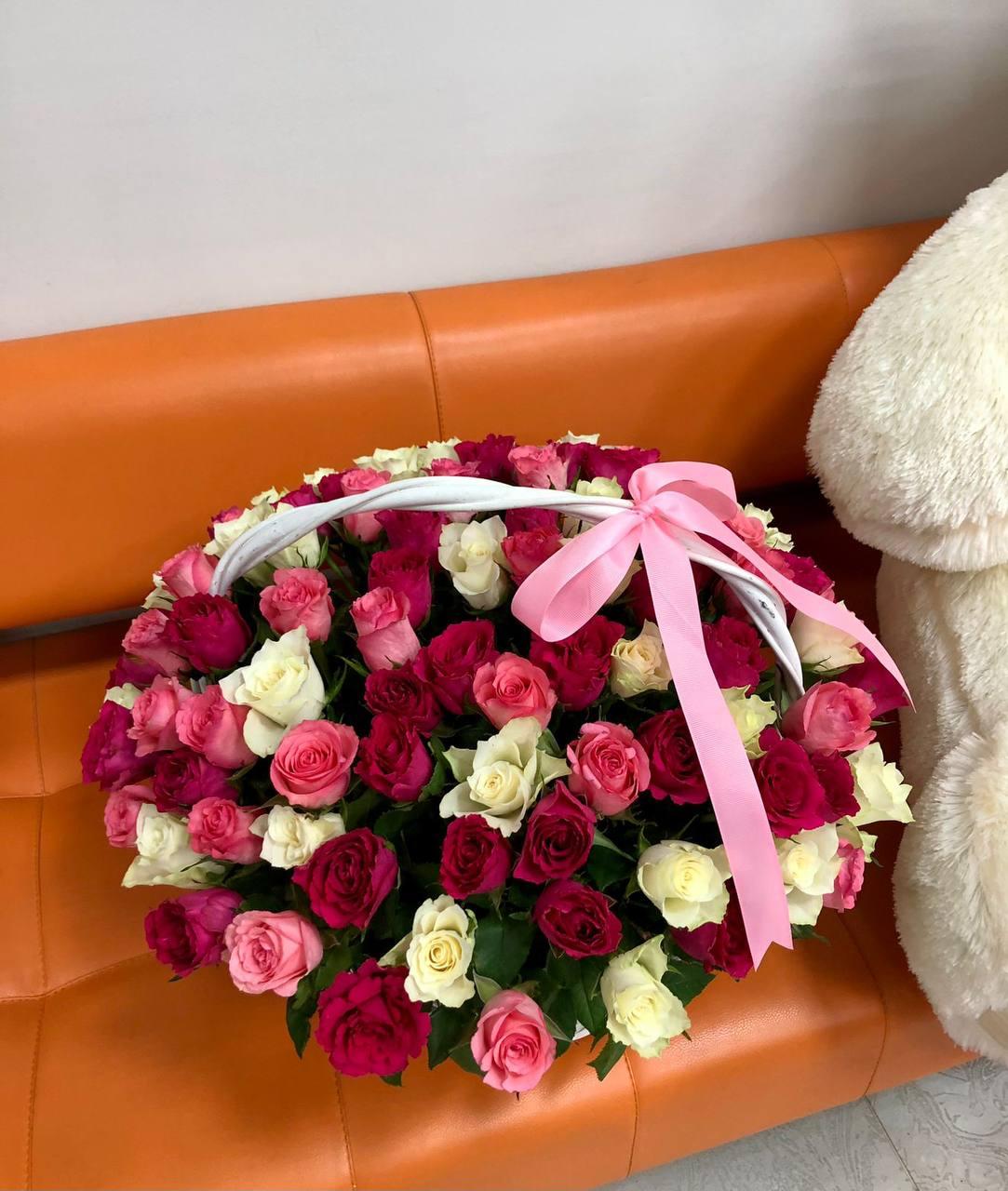 101 роза разноцветный микс в корзине
