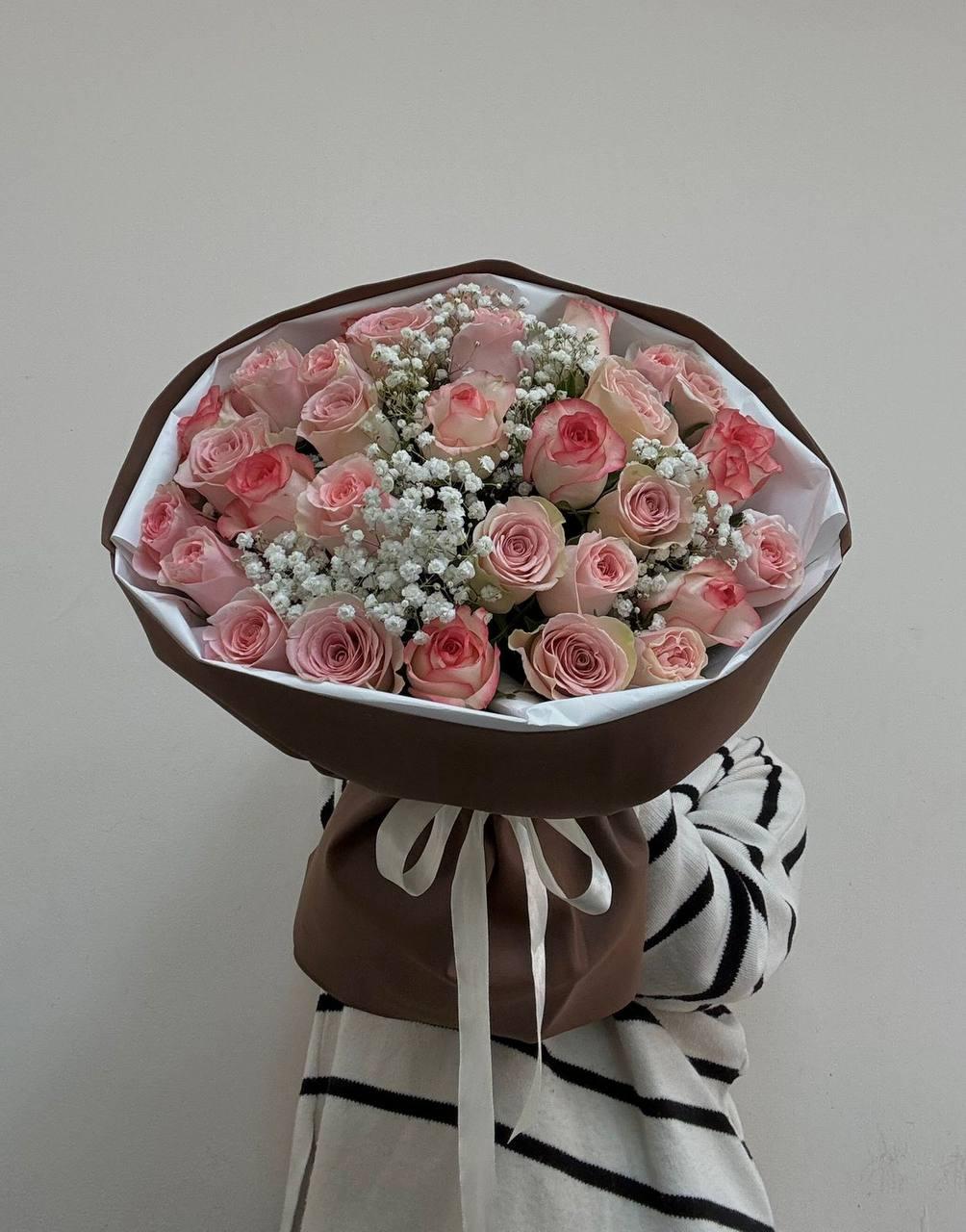 31 роза с гипсофилой в шоколадной упаковке3200 ₽Стильный, интересный букет из 31 розы микс с нежной гипсофилойЗаказать