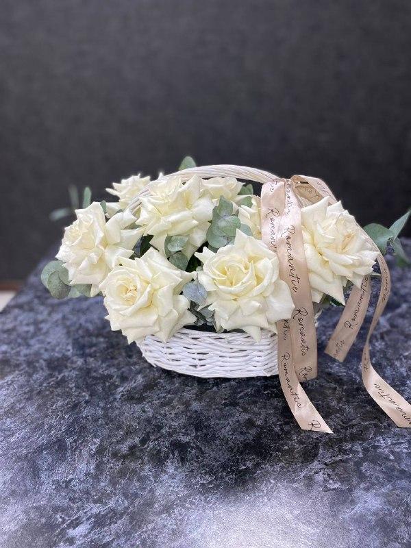 Стильная корзинка из 13 белых французских роз и эвкалипта