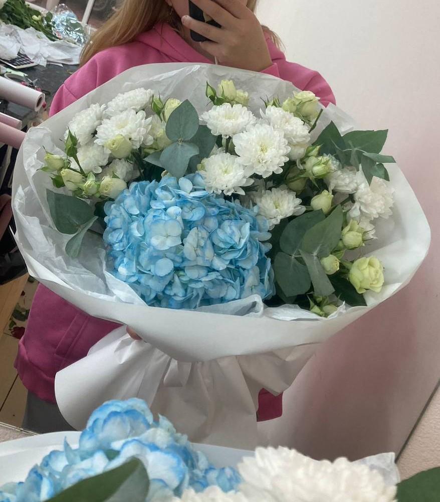 Гортензия, хризантема, эвкалпит, кустовая роза