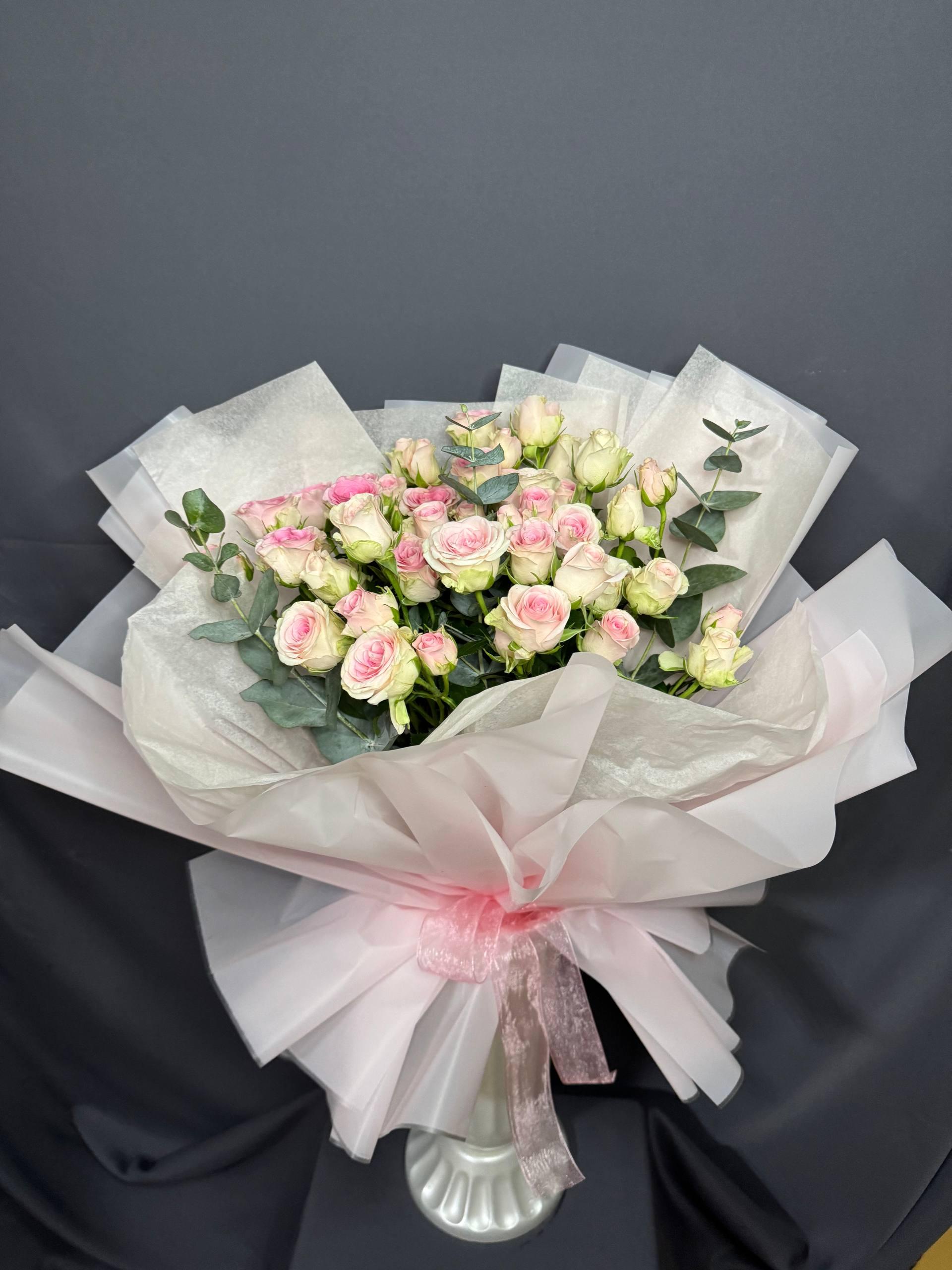 Кустовая роза и эвкалипт в упаковке в корейском стиле