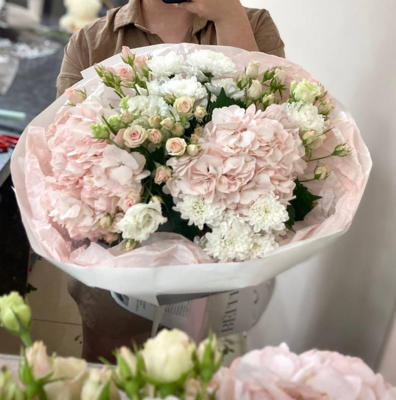 Сборный букет из гортензии, хризантемы и кустовой розы